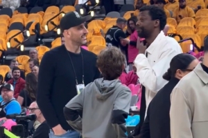 體育資訊4月20日訊 今日西部季后賽首輪馬刺對陣開拓者,賽前有記者拍到文班亞馬父親和馬刺名宿吉諾比利在場邊熱聊。