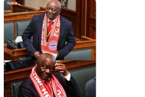 孔帕尼父親、比利時議員皮埃爾·孔帕尼今天戴著拜仁圍巾參加議會。